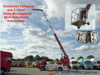 Interne Fahrzeugnr.: 6121, Standort: Nutzfahrzeuge 2000 GmbH in Sottrum (PLZ 27367), Hertzstr. 2, Deutsches Fahrzeug, 1. Hand, ***Original NUR 168.988 KM***, Zustand, siehe Fotos, Dachdecker- Montagekran vom Premium Hersteller Klaas, Klaas ALU KRAN TYP K36-46 TF, Hakenhöhe max. 46 Meter, Fernbedienung mit Display, Last & Reichweite: 2.000 kg 14,00 m - 1.200 kg 21,00 m -800 kg 24,00 m - 500 kg 30,00 m - 250 kg 38,00 m, Schwerlastwinde, Windenzugkraft 2.000 kg, Windengeschwindigkeit 50 m/min, Separater Dieselmotor, Arbeitskorb 200 Kg Traglast, Sicherheits-SPS-Kransteuerung, 4 Hydraulische Abstützungen, 2x Anhängerkupplung, Anhängelast 19.000 Kg, 2 Sitzplätze, luftgefederter Komfortsitz, ABS und ASR, Nebenantrieb, Differentialsperre, Dachluke, Berganfahrhilfe, Schaltgetriebe 8 Gänge, Radio CD, Bordcomputer, Servolenkung, Blattfederung, Multifunktionslenkrad, elektrische Spiegel beheizbar, Reserverad, Anfahrspiegel, Radstand 4.200 mm, zGG 15.000 Kg, Leergewicht 14.450 Kg, Selbstfahrende Arbeitsmaschine, daher Mautfrei und freie Fahrt in allen Umwelt Zonen